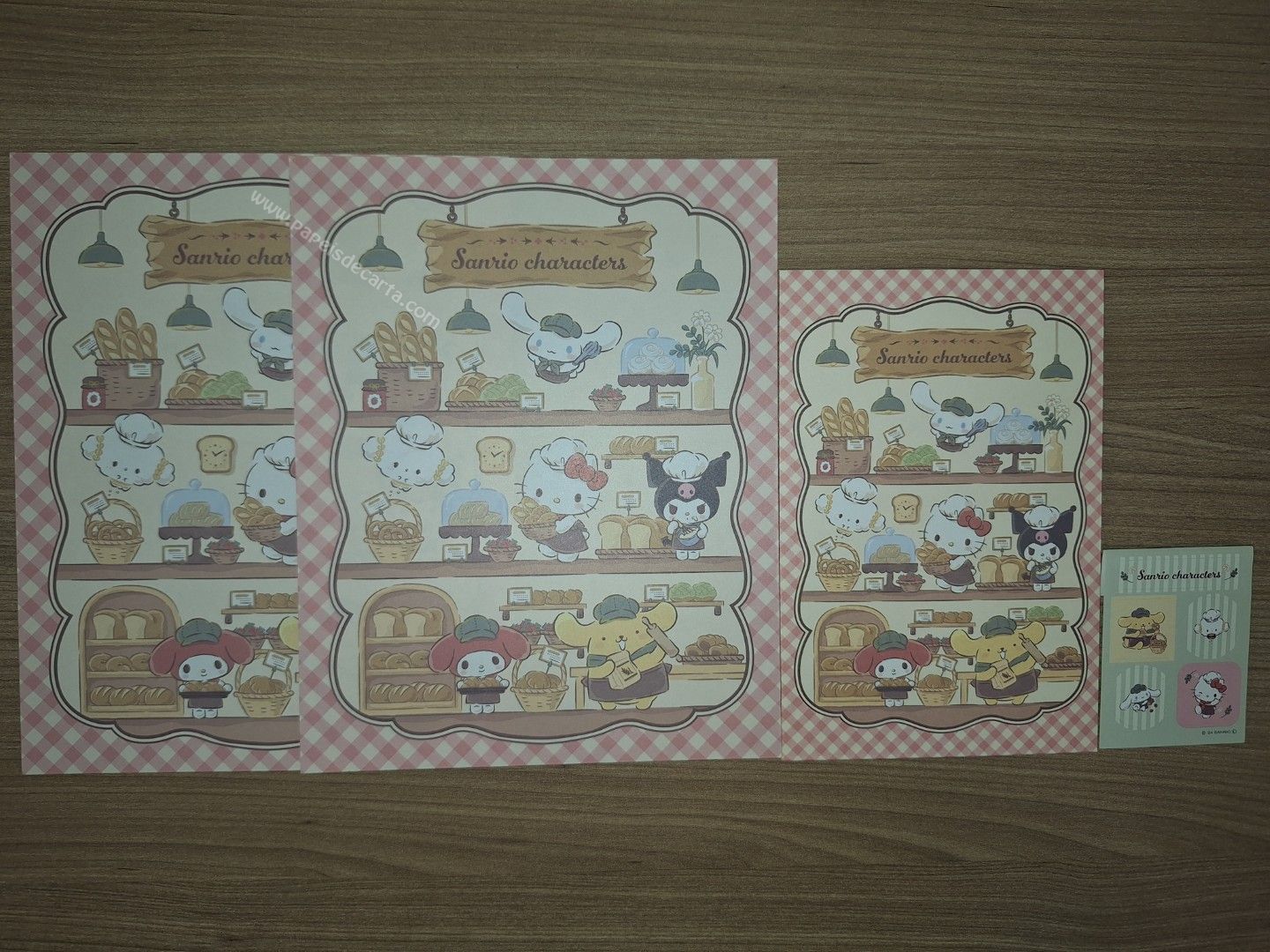 Conjunto de papel de carta importado com 2 folhas e 1 envelope e 1 cartelinha de adesivos, da Sanrio Characters.