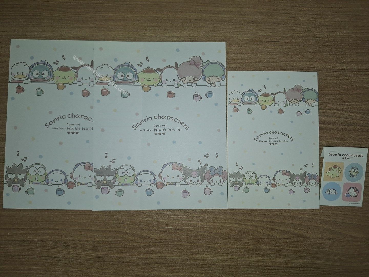 Conjunto de papel de carta importado com 2 folhas e 1 envelope e 1 cartelinha de adesivos, da Sanrio Characters.