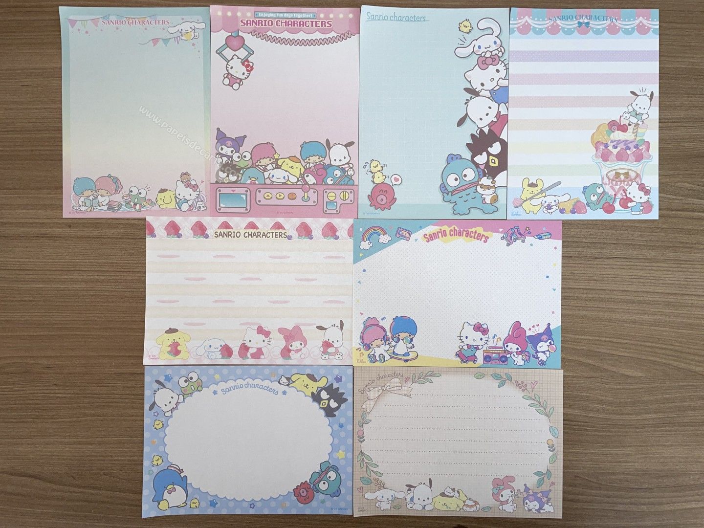 Lote com 8 papéis de carta pequenos importados da Sanrio Characters. Tamanho: 10,5cm x 15cm.