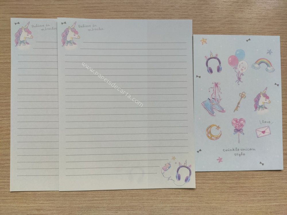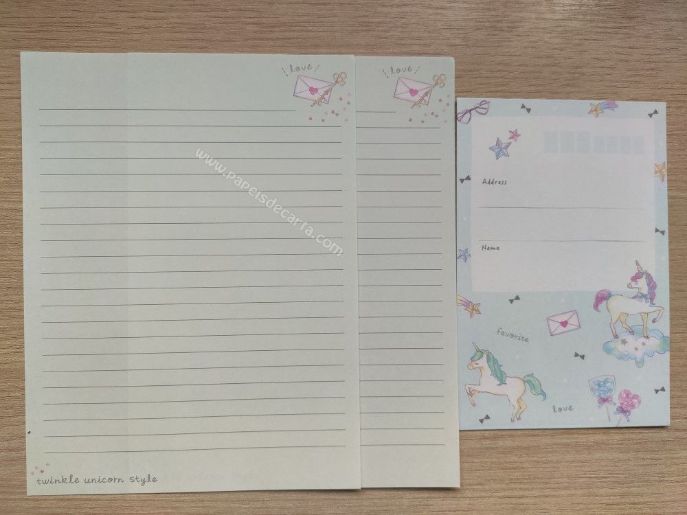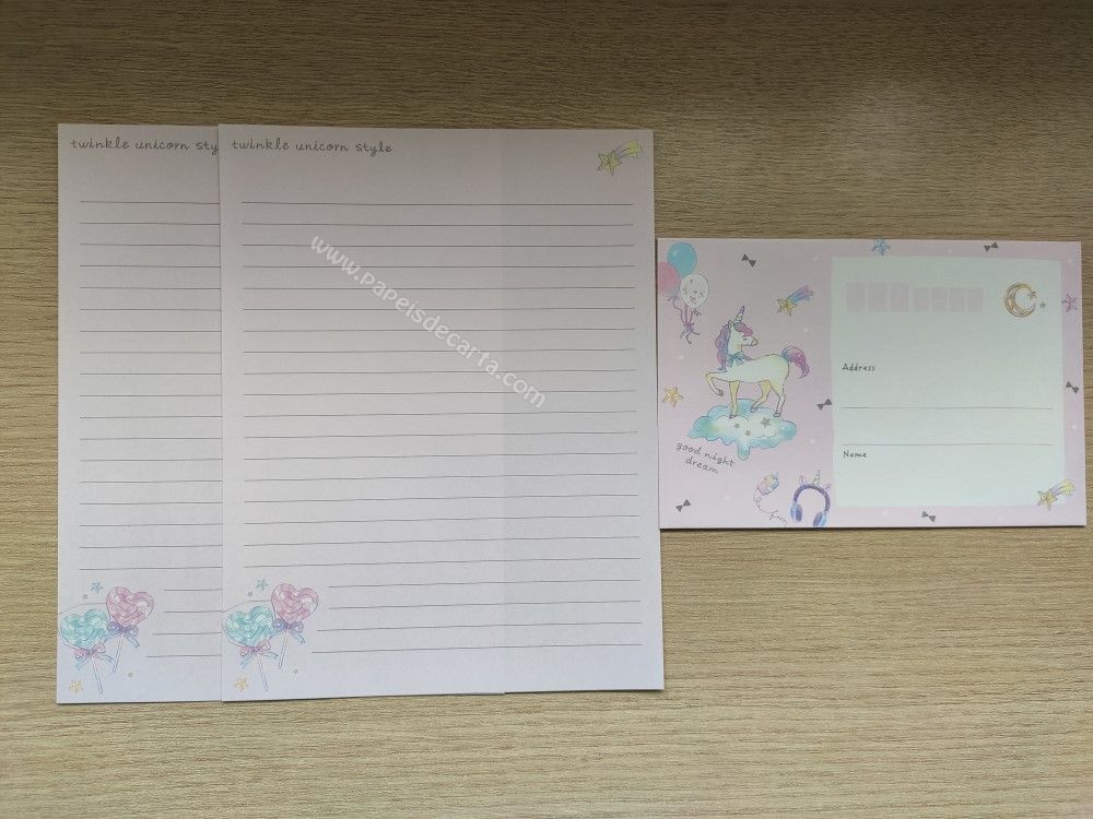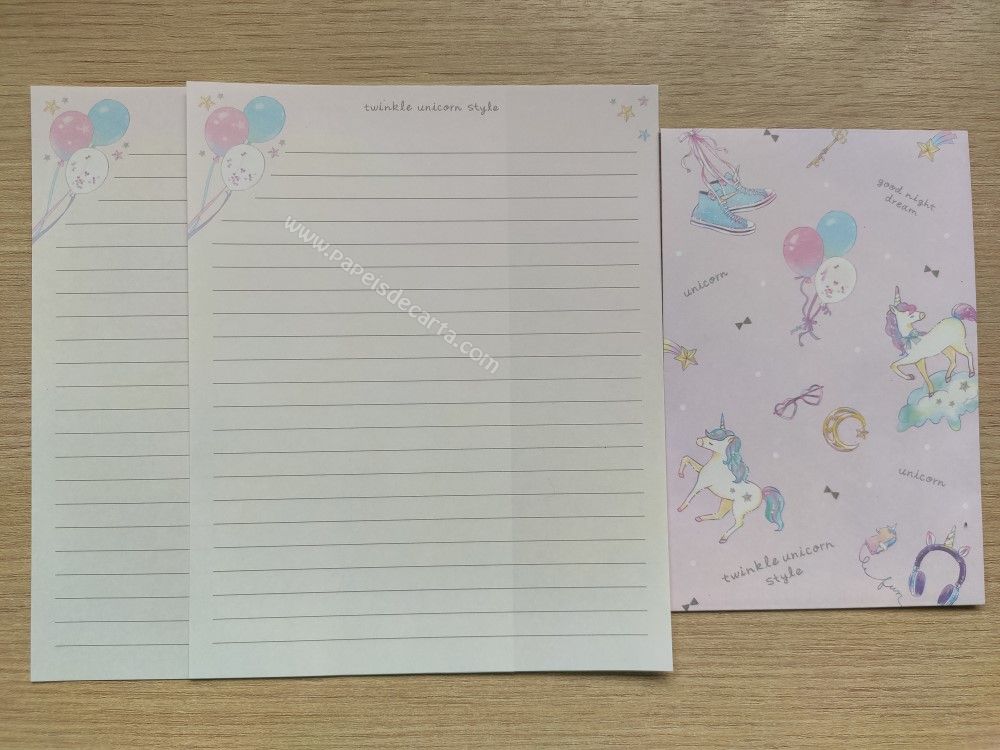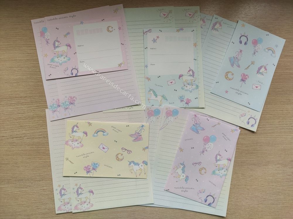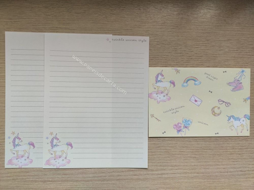 Lote com 5 conjuntos importados, sendo 2 folhas iguais e 1 envelope cada conjunto, da coleção Twinkle unicorn style.