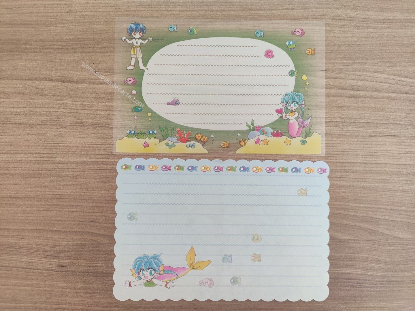 Papel de carta importado, tamanho pequeno, com 2 folhas, sendo uma das folhas em plástico.