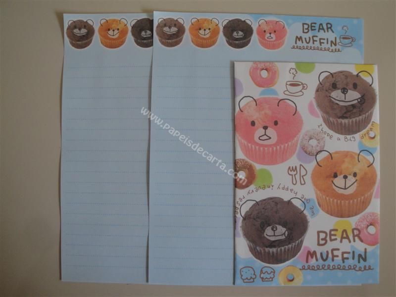 Conjunto importado, de papel de carta com 2 folhas iguais e 1 envelope do Bear Muffin.