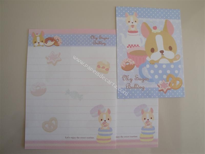 Conjunto importado, de papel de carta com 2 folhas pequenas iguais e 1 envelope do My Sugar Bulldog.