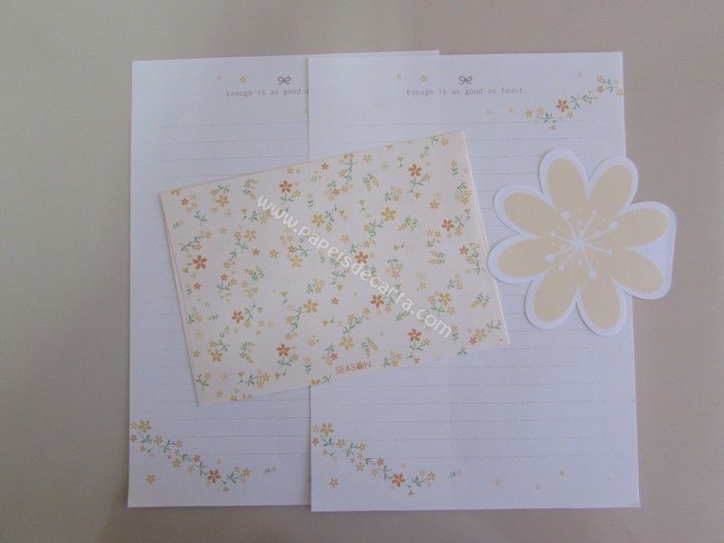 Conjunto importado, de papel de carta, com 2 folhas iguais, 1 envelope e 1 notinha. Cor: Amarelo. Frase: Enough is as good as feast.
