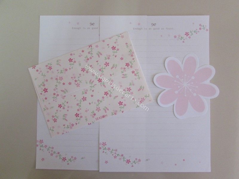 Conjunto importado, de papel de carta, com 2 folhas iguais, 1 envelope e 1 notinha. Cor: Rosa. Frase: Enough is as good as feast.