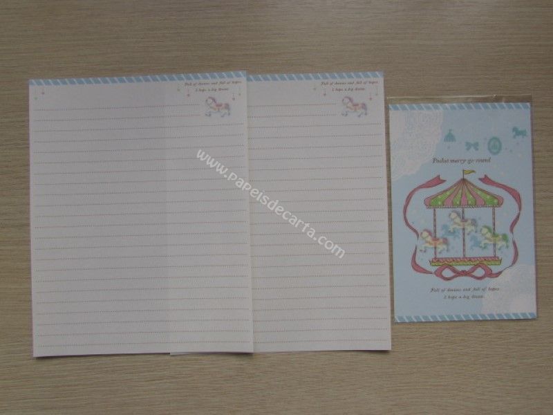 Conjunto importado, de papel de carta com 2 folhas iguais e 1 envelope da coleção Pocket merry-go-round.