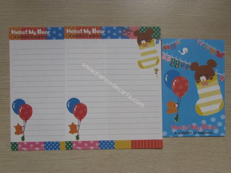 Conjunto importado, de papel de carta com 2 folhas iguais e 1 envelope da coleção Hello! Mr. Bear.