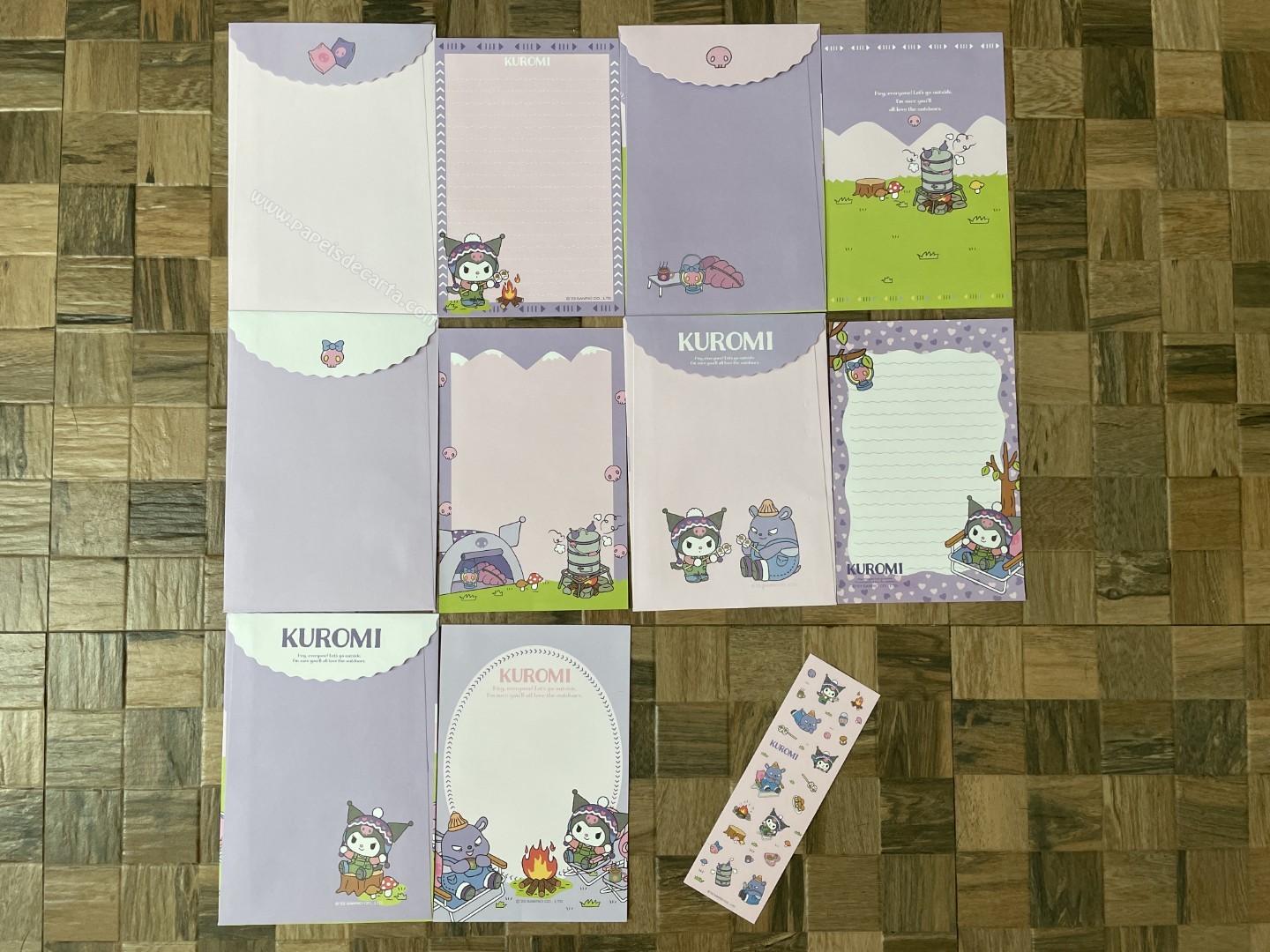 Lote de papel de carta importado da Kuromi - Sanrio, com 5 conjuntos diferentes com 1 folha e 1 envelope cada + 1 cartela de adesivos. Tamanho da folha: 12,5 cm (larg) X 19 cm (alt). Tamanho do envelope: 13,5 cm (larg) x 20cm (alt). Folha e envelope tem desenho frente e verso.