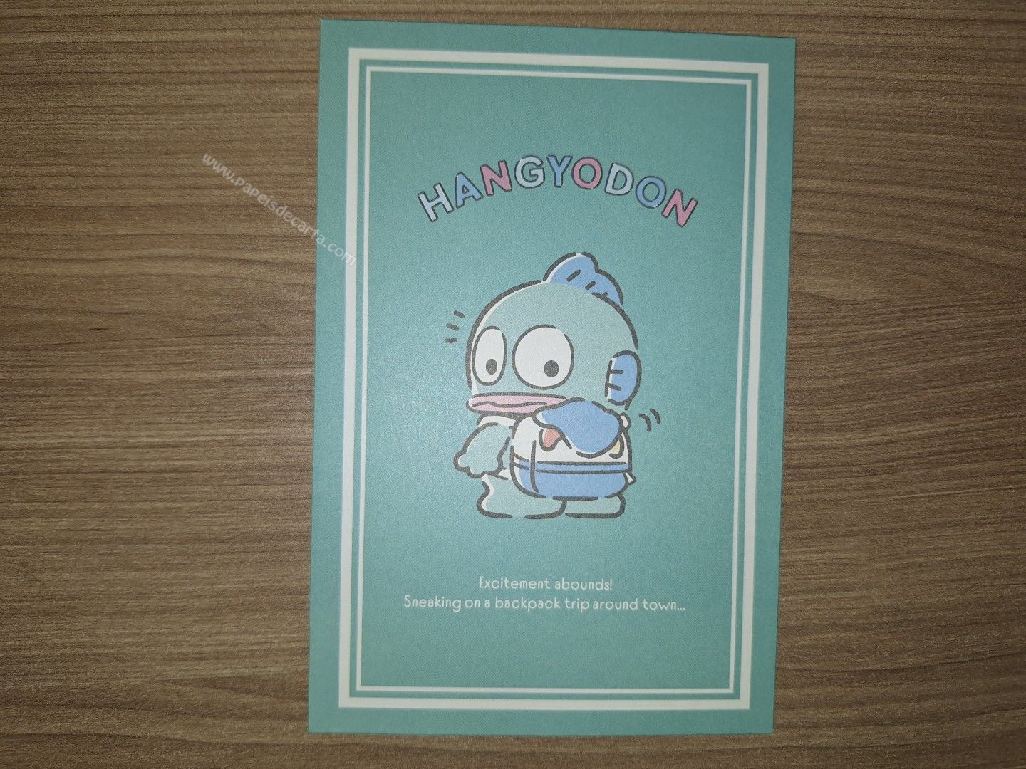 Conjunto importado, de papel de carta com 2 folhas iguais e 1 envelope e 1 cartelinha de adesivos do Hangyodon, da Sanrio.