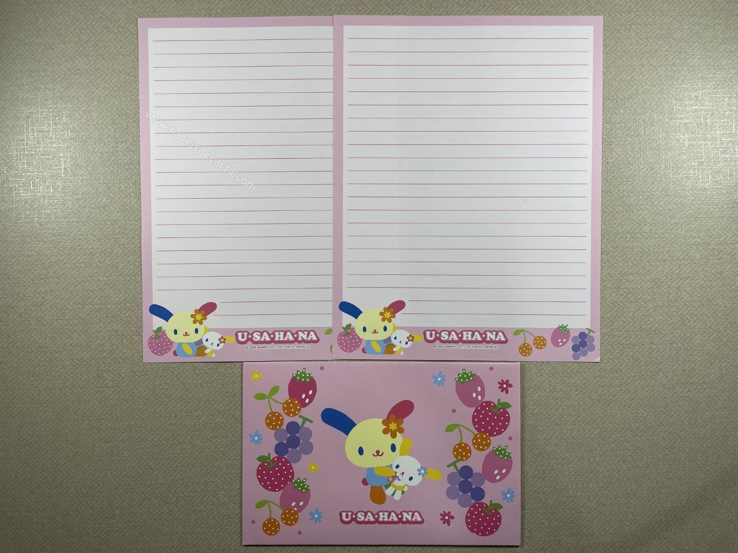 Conjunto de papel de carta importado da U-Sa-Ha-Na - Sanrio, com 2 folhas e 1 envelope. Tamanho médio