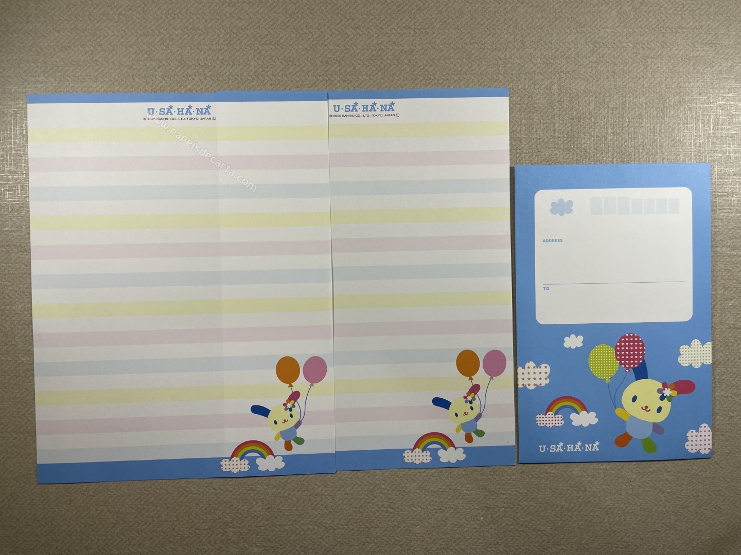 Conjunto de papel de carta importado da U-Sa-Ha-Na - Sanrio, com 2 folhas e 1 envelope. Tamanho médio