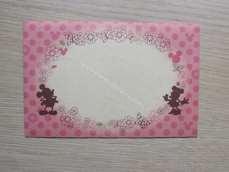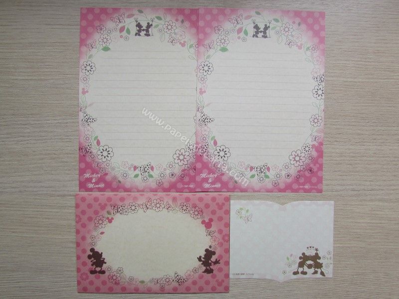 Conjunto importado, de papel de carta do Mickey e da Minnie, com 2 folhas iguais, 1 envelope e 1 notinha, da Disney.