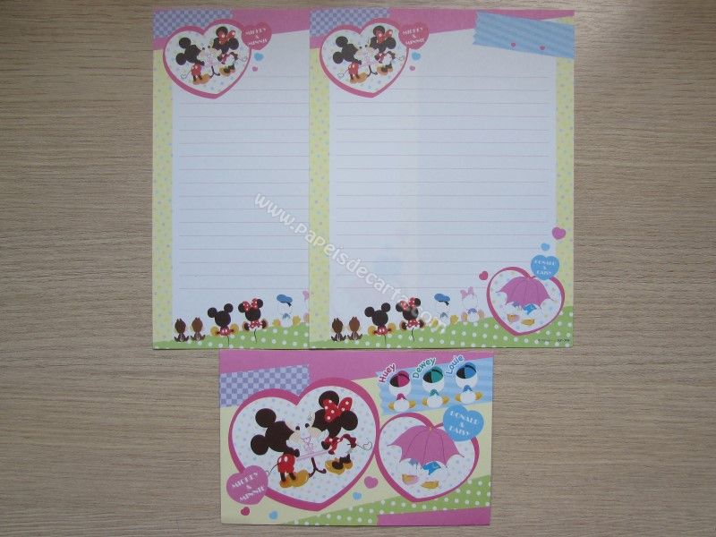 Conjunto importado, de papel de carta do Mickey e da Minnie, com 2 folhas iguais, 1 envelope, da Disney.