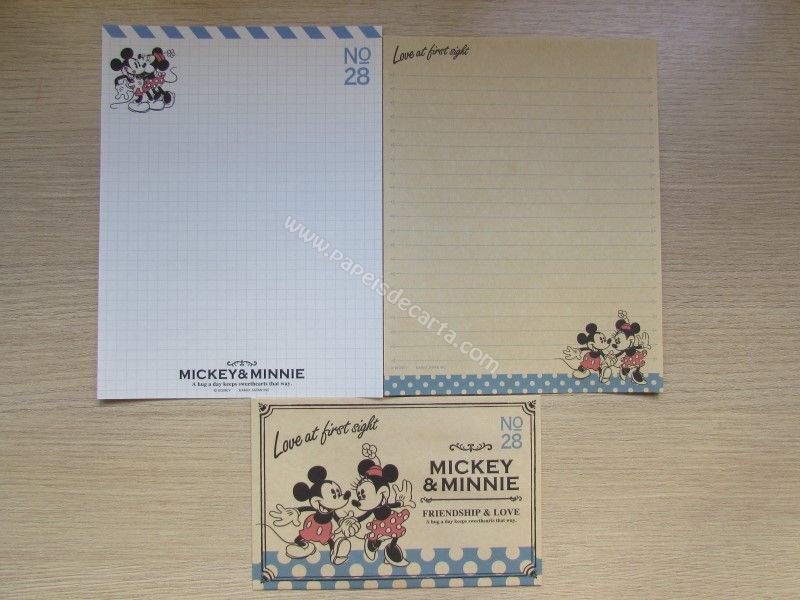 Conjunto importado, de papel de carta do Mickey e da Minnie, com 2 folhas diferentes, 1 envelope, da Disney.