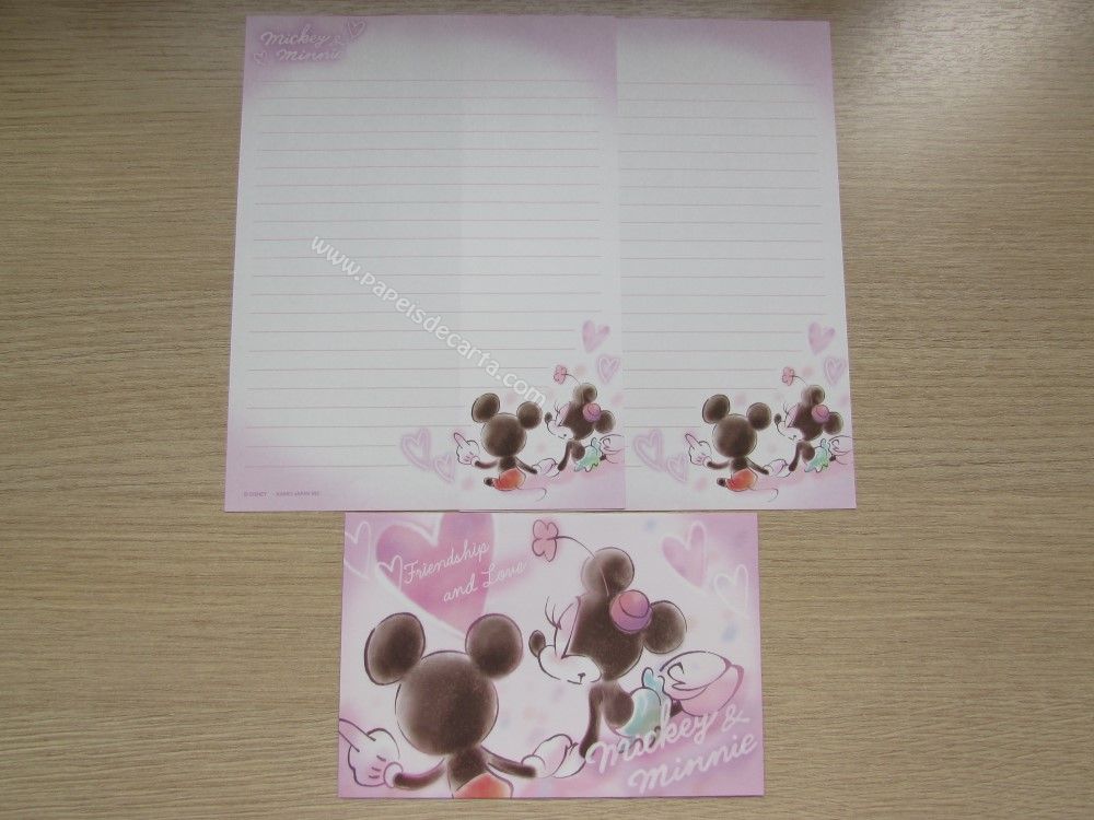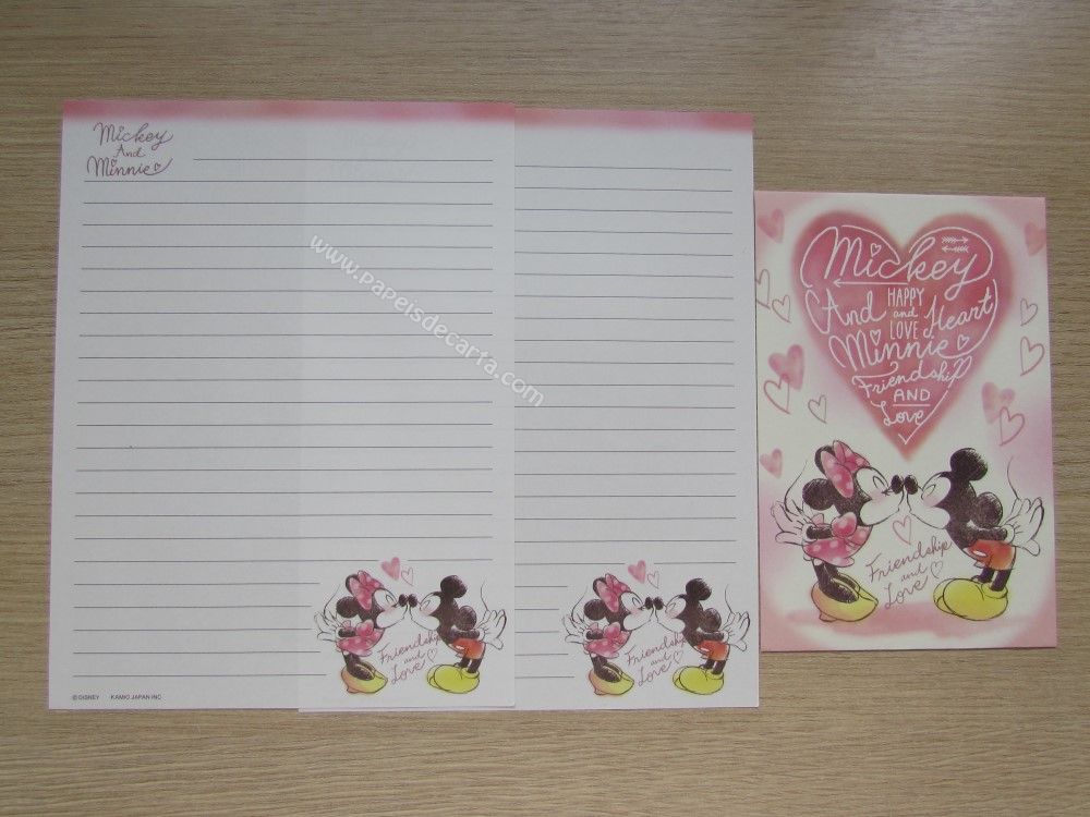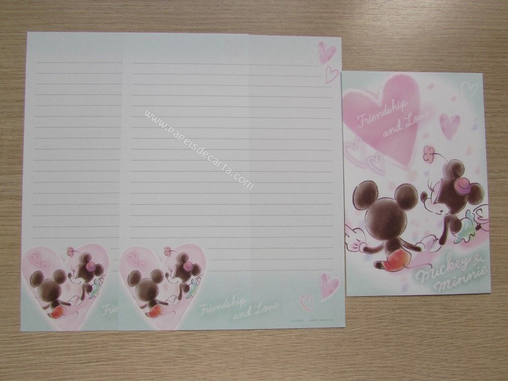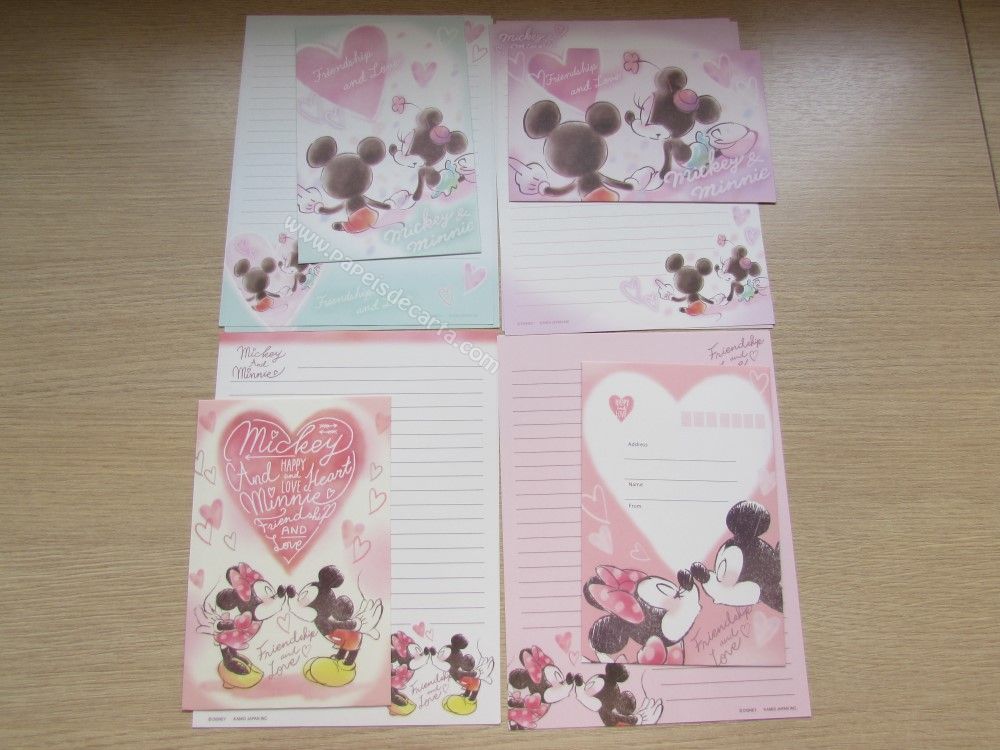 Lote importado, de papel de carta com 4 conjuntos diferentes do Mickey & Minnie, sendo 2 folhas iguais e 1 envelope cada conjunto. Tamanho pequeno.