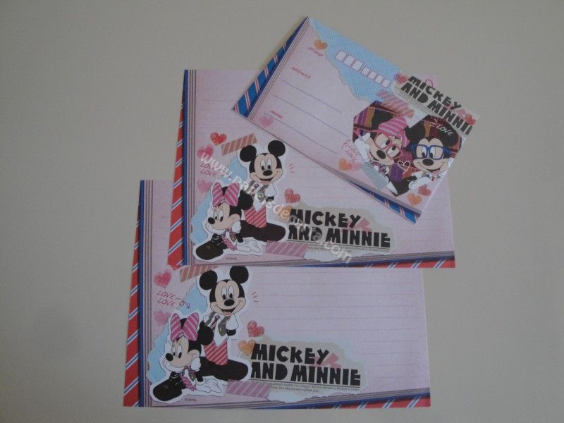 Conjunto importado, de papel de carta com 2 folhas iguais e 1 envelope do Mickey e da Minnie.