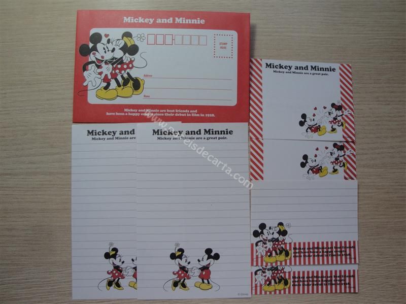 Conjunto de papel de carta Mickey e Minniel - Disney com 2 folhas iguais, 1 envelope e 4 memos (sendo 2 modelos diferentes).