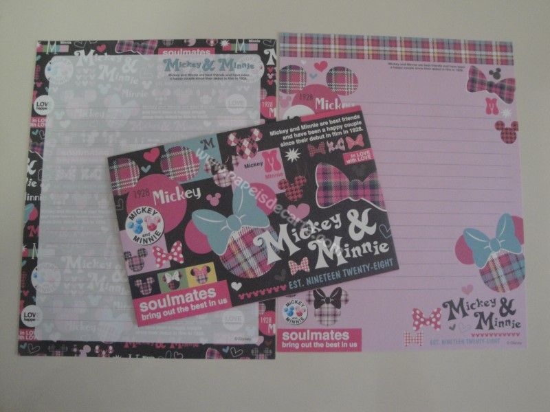 Conjunto importado, de papel de carta do Mickey e da Minnie, da Disney, com 2 folhas diferentes e 1 envelope.