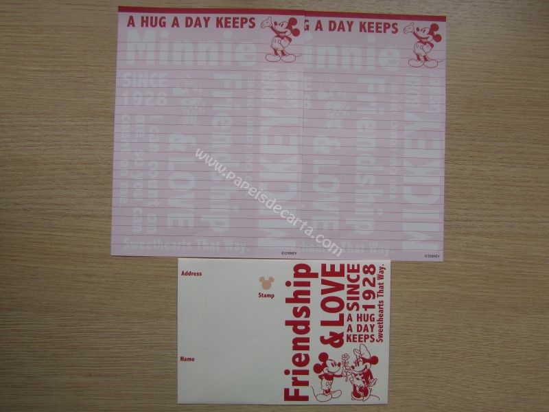 Conjunto importado, de papel de carta do Mickey e da Minnie, com 2 folhas iguais e 1 envelope, da Disney.