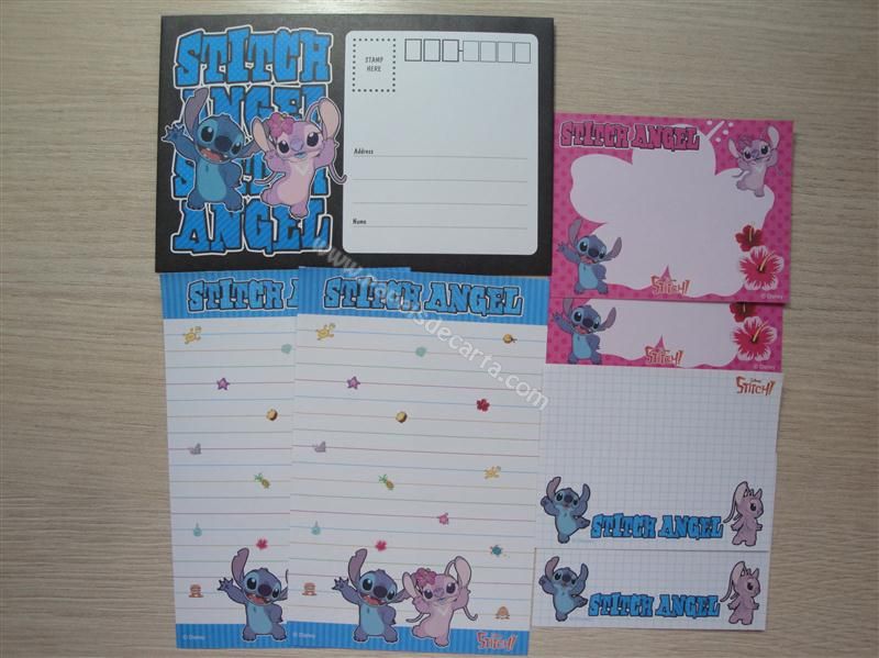 Conjunto importado, de papel de carta com 2 folhas iguais, 4 notinhas (sendo 2 modelos diferentes) e 1 envelope do Stitch Angel.