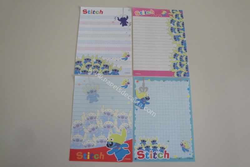 Conjunto importado, de papel de carta com 4 notinhas diferentes do Stitch.