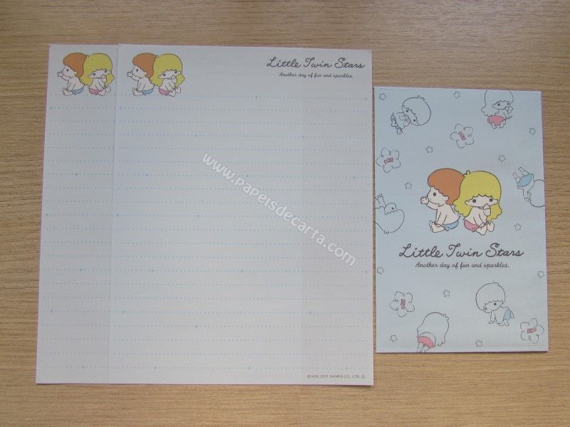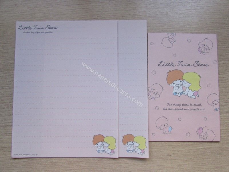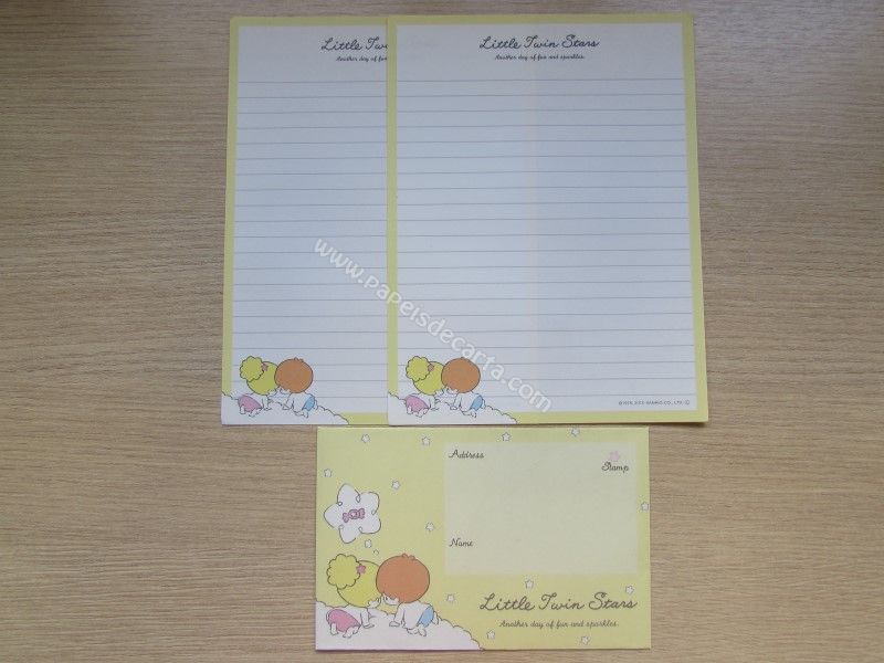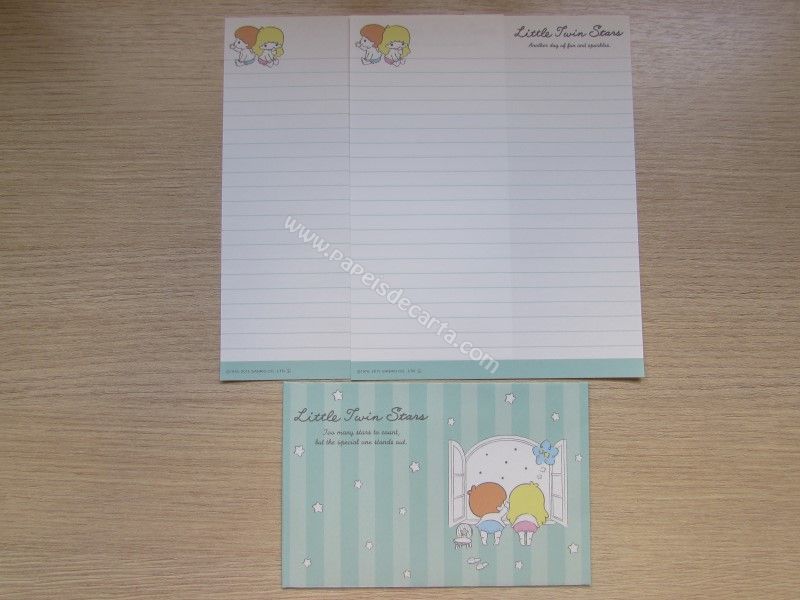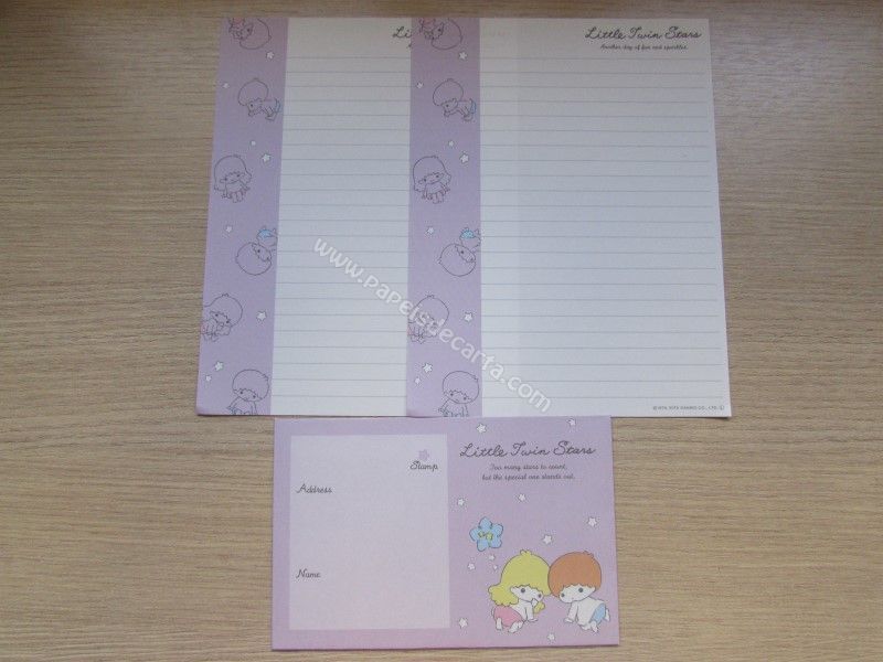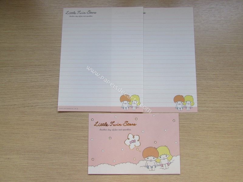 Lote de papel de carta dos Little Twin Stars com 6 conjuntos importados, tamanho médio, sendo 2 folhas iguais e 1 envelope cada conjunto.