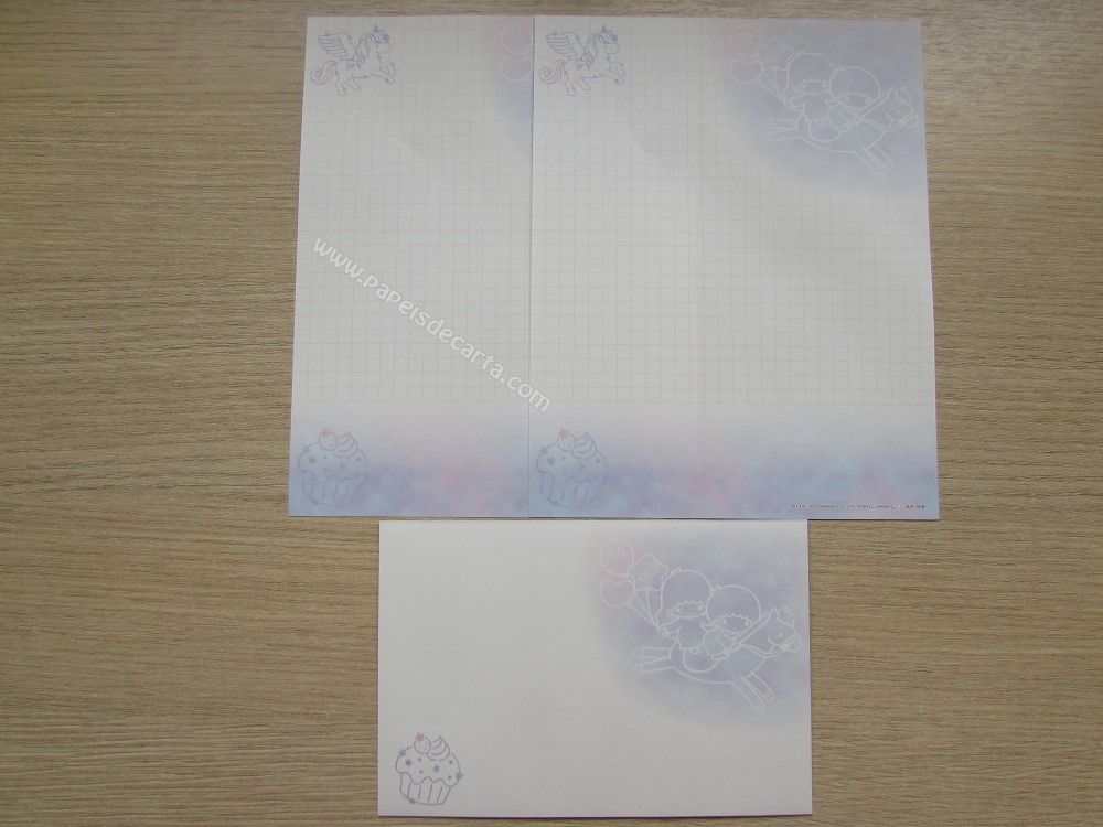 Conjunto importado de papel de carta dos Little Twin Stars, com 2 folhas iguais e 1 envelope. Tamanho médio. Fabricante: Sanrio.