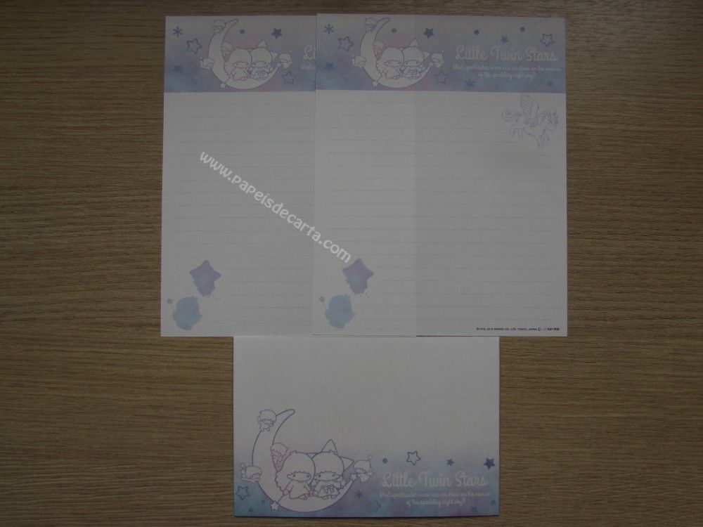 Conjunto importado de papel de carta dos Little Twin Stars, com 2 folhas iguais e 1 envelope. Tamanho médio. Fabricante: Sanrio.