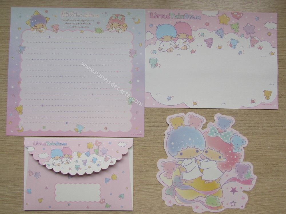 Conjunto importado de papel de carta dos Little Twin Stars, com 2 folhas diferentes, 1 notinha e 1 envelope. Tamanho médio. Fabricante: Sanrio.