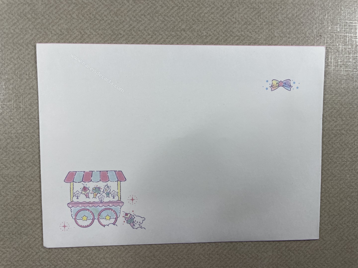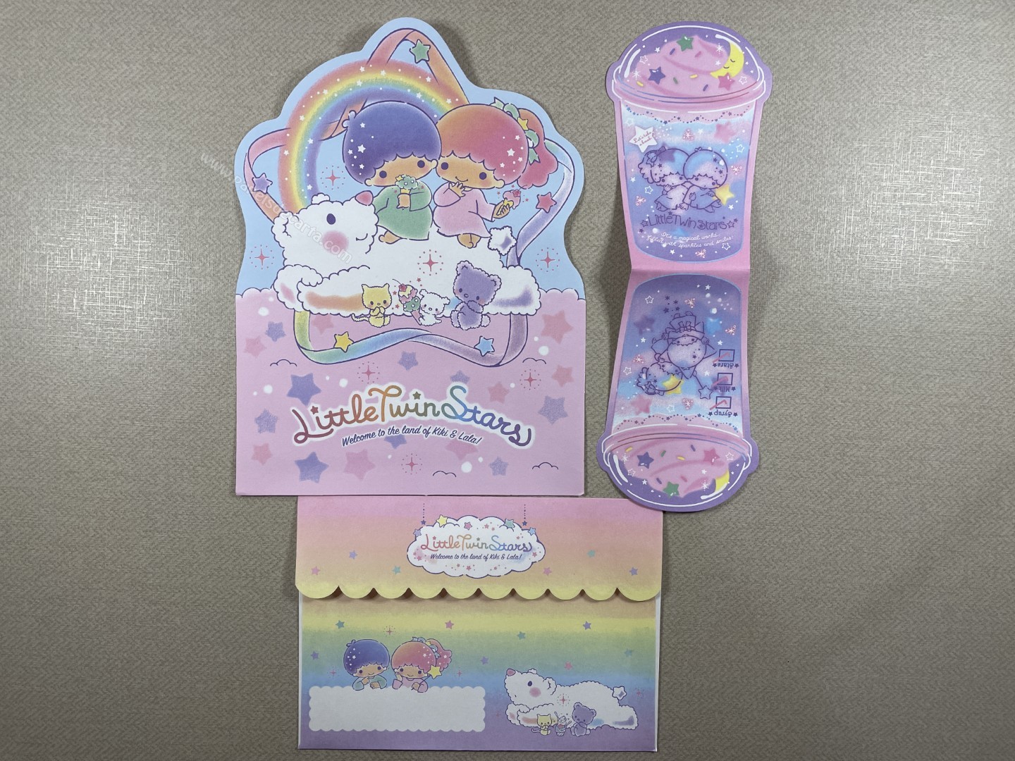 Conjunto importado de papel de carta dos Little Twin Stars, com 1 folha, 1 notinha e 1 envelope. Tamanho médio. Fabricante: Sanrio.