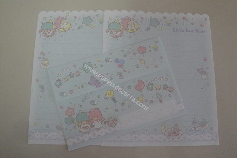 Conjunto de papel de carta importado, com 2 folhas iguais e 1 envelope dos Little Twin Stars, da Sanrio.