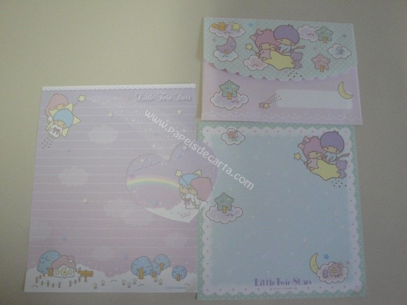 Conjunto importado, de papel de carta dos Little Twin Stars, com 2 folhas diferentes, 1 notinha e 1 envelope, da Sanrio.