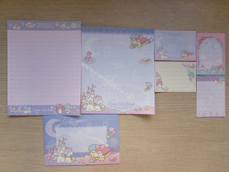 Conjunto importado, de papel de carta com 2 folhas diferentes, 4 notinhas diferentes e 1 envelope dos Little Twin Stars. Fabricante: Sun-star