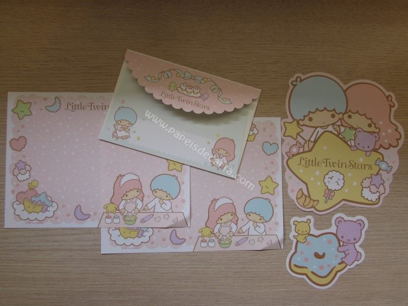 Conjunto importado de papel de carta dos Little Twin Stars, com 2 folhas diferentes, 2 notinhas e 1 envelope, da Sanrio. Fabricante: Sanrio.