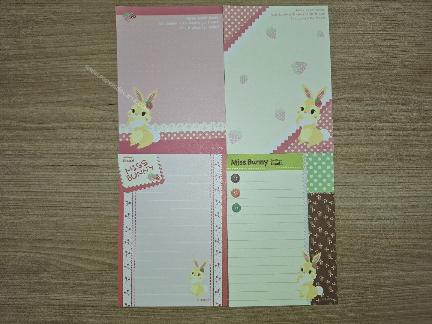 Conjunto importado, de papel de carta com 4 notinhas diferentes da Miss Bunny.