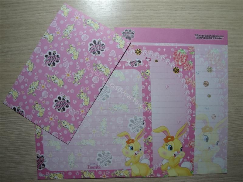 Conjunto importado, de papel de carta com 3 folhas diferentes e 1 envelope da Miss Bunny.