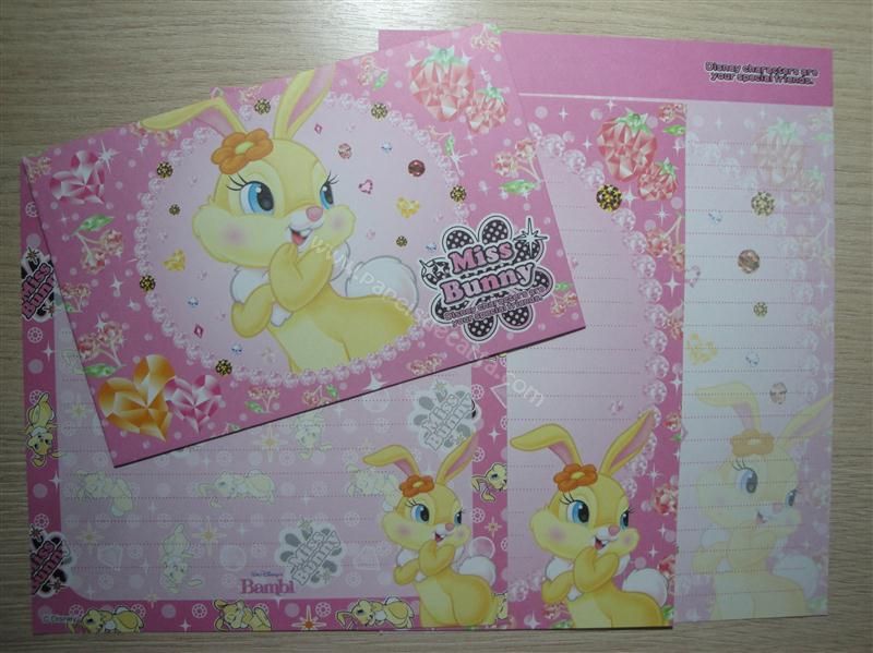 Conjunto importado, de papel de carta com 3 folhas diferentes e 1 envelope da Miss Bunny.