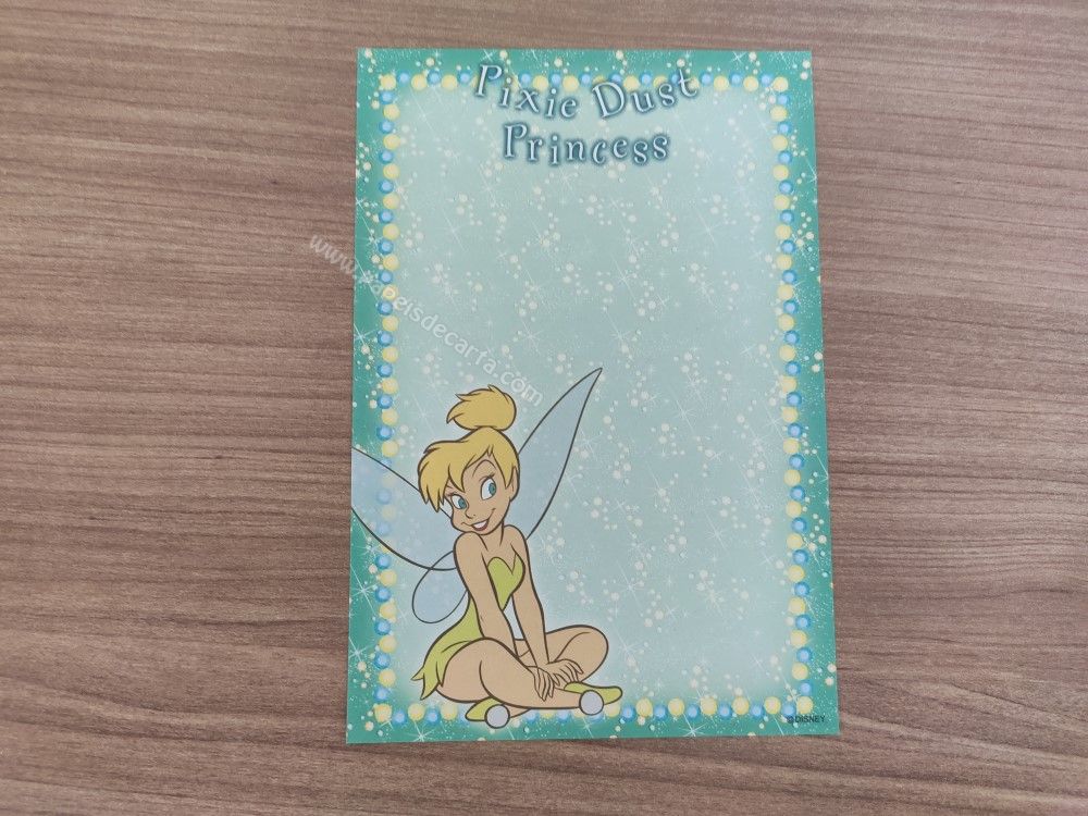 Papel de carta pequeno da Tinker Bell (Sininho), da Disney. TAMANHO DO PAPEL: ALT: 14,5cm - LARG: 10cm