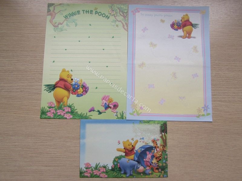 Conjunto importado, de papel de carta do Pooh, tamanho médio, com 2 folhas diferentes e 1 envelope, da Disney.