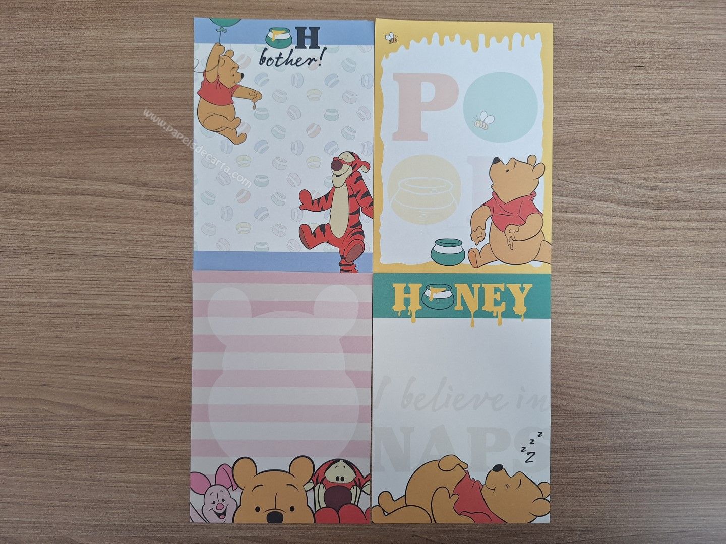 Lote de papel de carta pequeno, com 4 folhas diferentes do Ursinho Pooh, da Disney.
