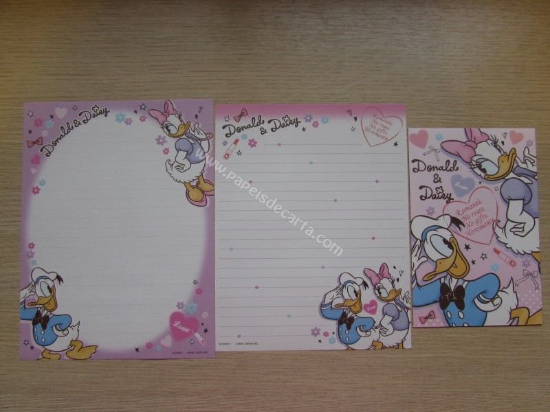Conjunto importado, de papel de carta do Donald Duck (Pato Donald) e da Miss Daisy (Margarida), com 2 folhas diferentes e 1 envelope, da Disney.