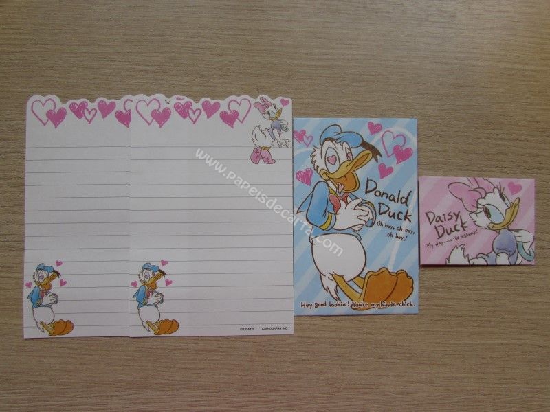Conjunto importado, de papel de carta do Donald e Dayse, com 2 folhas pequenas iguais, 1 envelope pequeno e 1 mini envelope.