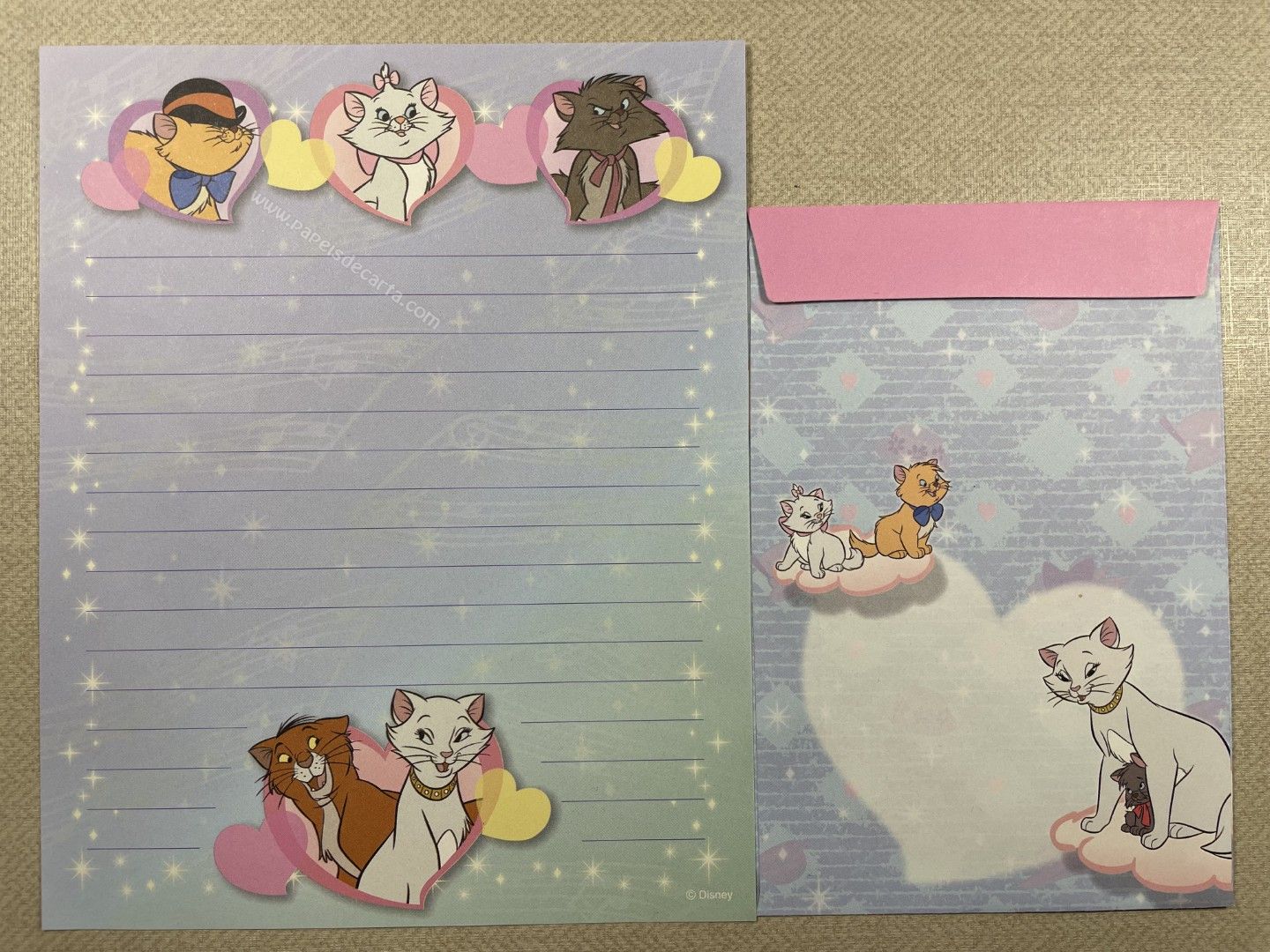 Conjunto importado, de papel de carta da The Aristocats (Marie), com 1 folha e 1 envelope, tamanho médio, da Disney.
