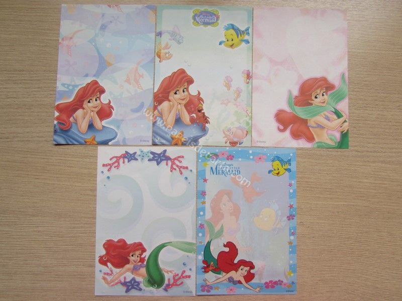 Lote de papel de carta pequeno, com 5 papéis diferentes da Disney Princess - Ariel - The Little Mermaid.
