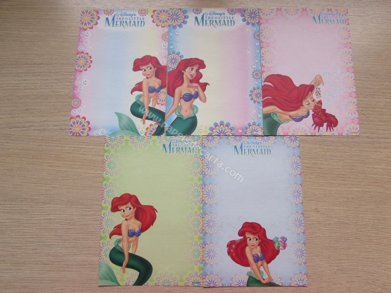 Lote de papel de carta pequeno, com 5 papéis diferentes da Disney Princess - Ariel - The Little Mermaid.