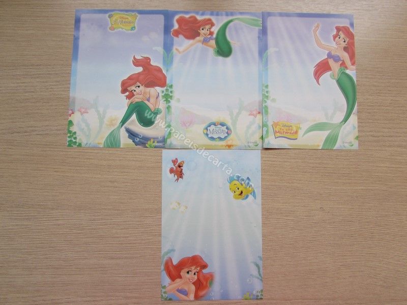 Lote de papel de carta pequeno, com 4 papéis diferentes da Disney Princess - Ariel - The Little Mermaid.