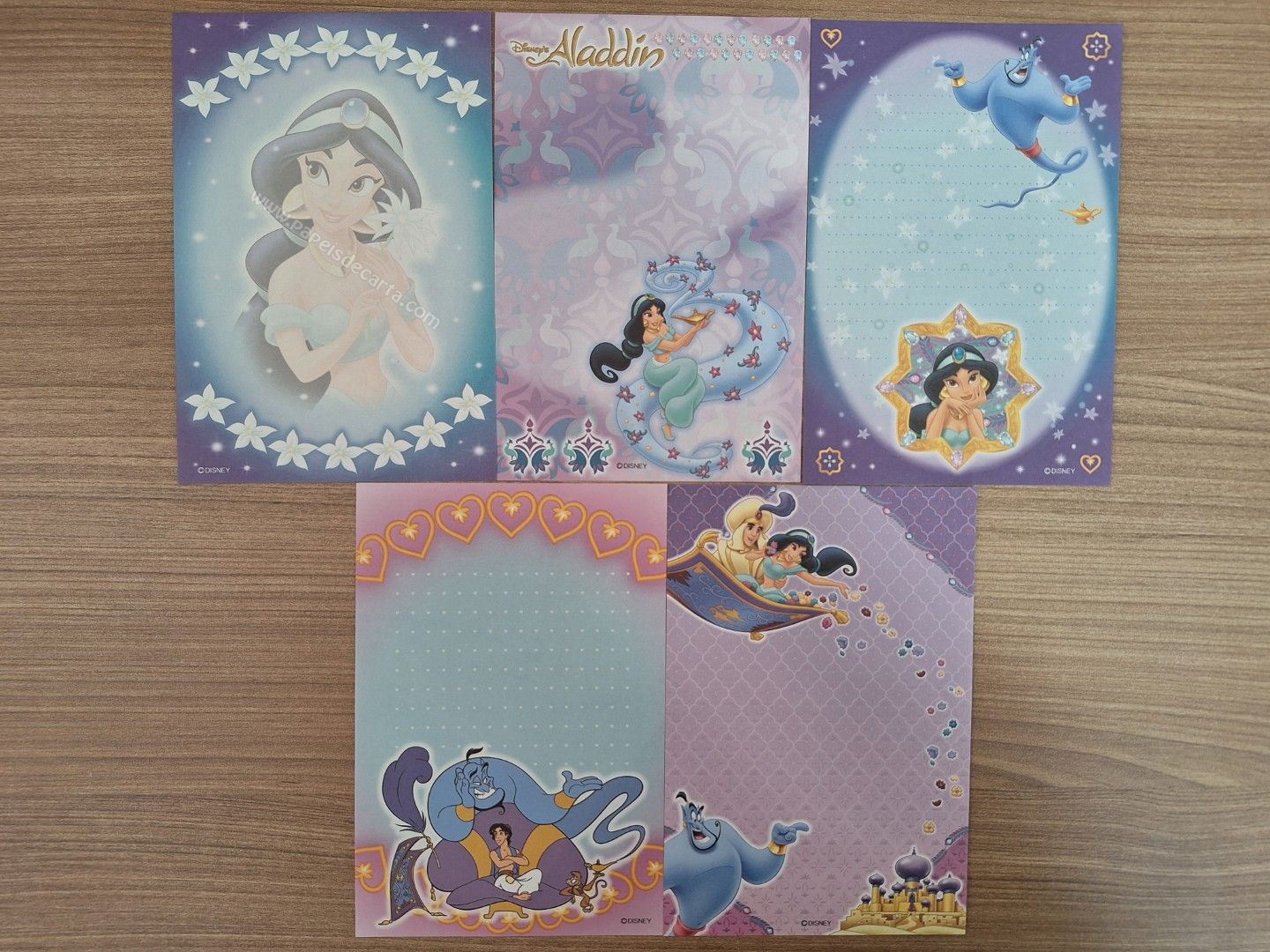 Lote com 5 papéis de carta, tamanho pequeno, princesas, do Aladdin, da Disney.