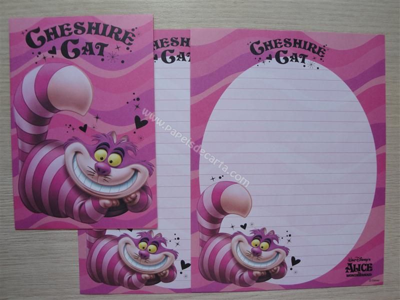 Conjunto importado, de papel de carta com 2 folhas iguais e 1 envelope do Cheshire Cat.