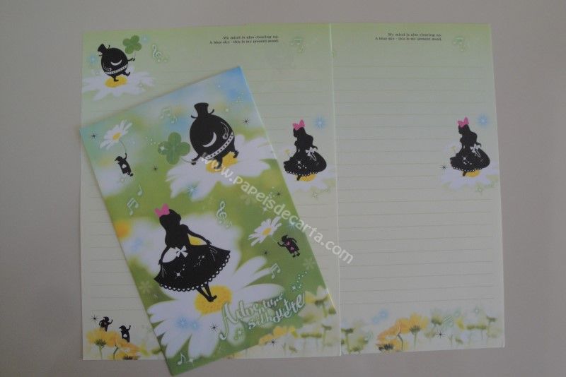 Conjunto importado, de papel de carta com 2 folhas iguais e 1 envelope da Alice. Obs: Papéis da linha Adventure Silhouette da SkyserCraper, da Kamio.
