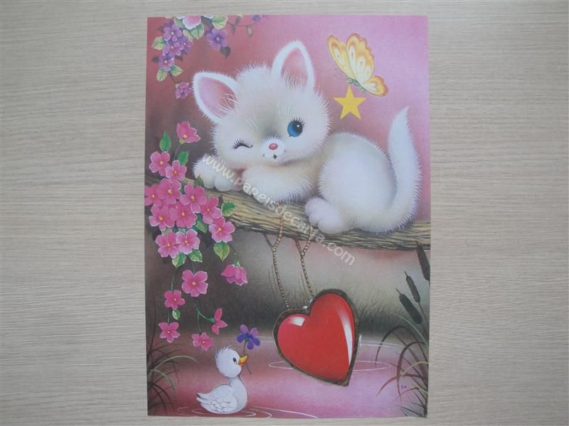Papel de carta grande antigo com um gatinho deitado em um tronco de árvore, com uma borboleta e um patinho observando ele.